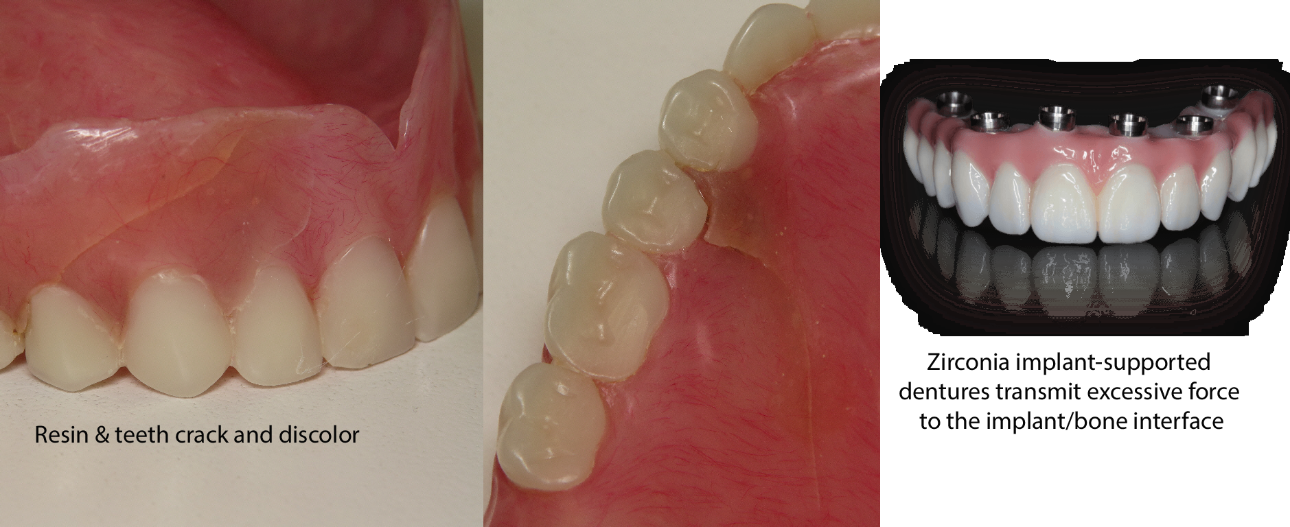 Resin denture materials were never designed to withstand the stress of total implant support. They tend to crack, discolor, and wear under occlusal stress. All zirconia implant-supported dentures are unforgiving when it comes to transmitting occlusal forces to the implant/bone interface.